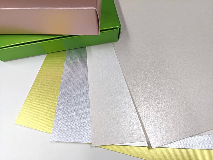 この方法は、コストを抑えられたり、印刷で色の調整ができたりする点がメリットですが、断面や折った部分から紙の素材の色(白色や灰色など)が見えてしまうことがあるため、“高級感”という面では少し劣ります。