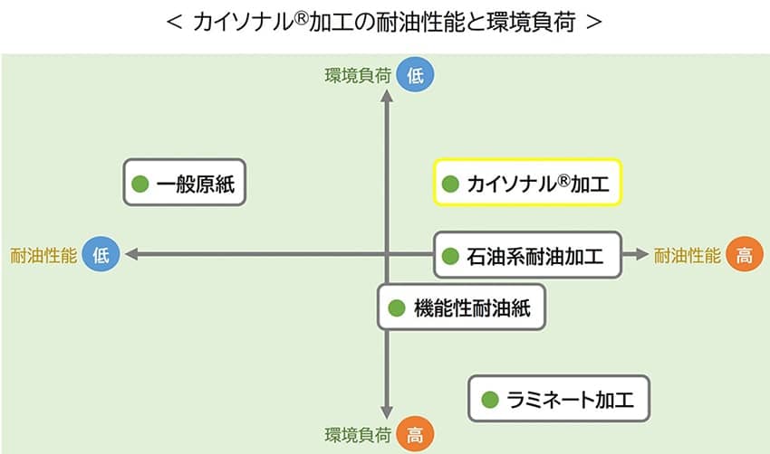 以下は、紙製の耐油機能付きパッケージに使用される主な素材と、一般原紙、カイソナル®加工の耐油性能と環境負荷を比較したマトリクス図です。