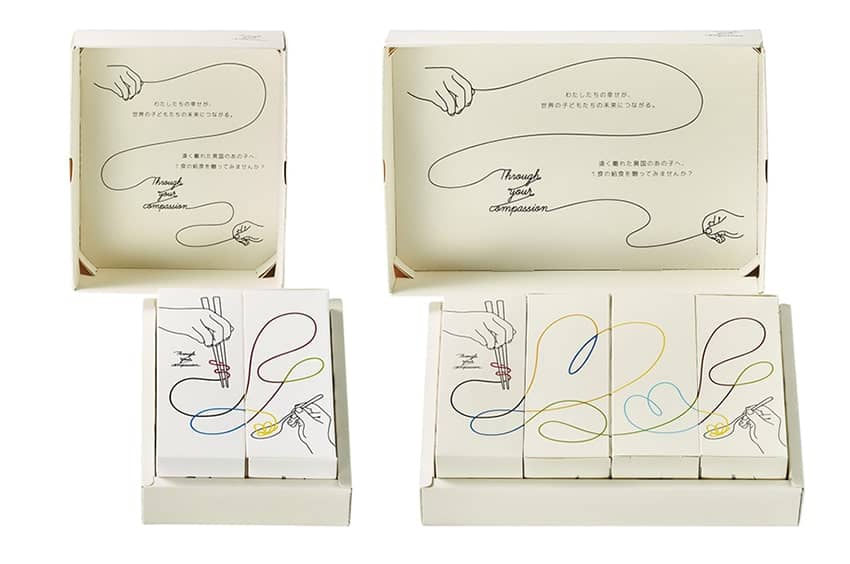 今回は2箱入りと4箱入りの2種類を販売予定だったので、小箱をセットする向き(どの面を上にするか)を変えることで、並べたときに1枚絵になるよう工夫しました。また、それが2箱入りと4箱入りのどちらでも成り立つようにしています。4箱入りの方は、長い1本線の途中に大きなハートが隠れている点もポイントです。カラフルな配色は、支援国の国旗の色を応用しています。