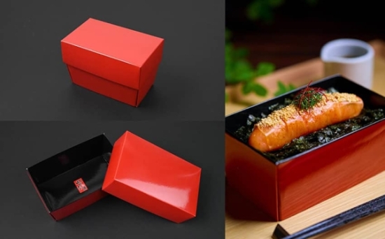 漆器の重箱を思わせる上質な佇まいに、細やかな設計の工夫を織り込んだめんたい重お持ち帰り用パッケージです。明太子は箱からわずかにはみ出すように設計し、立体感と重厚な存在感を演出しています。身箱は上面が広く、底面がややすぼまるテーパー形状とすることで、安定して重ねられる構造としました。また、蓋の内側には明太子との接触を避けるための空間を確保できる構造を開発し、見た目の美しさと味の繊細さを守ります。素材の魅力を引き立てる形状と、機能性の両立を実現した紙製重箱です。